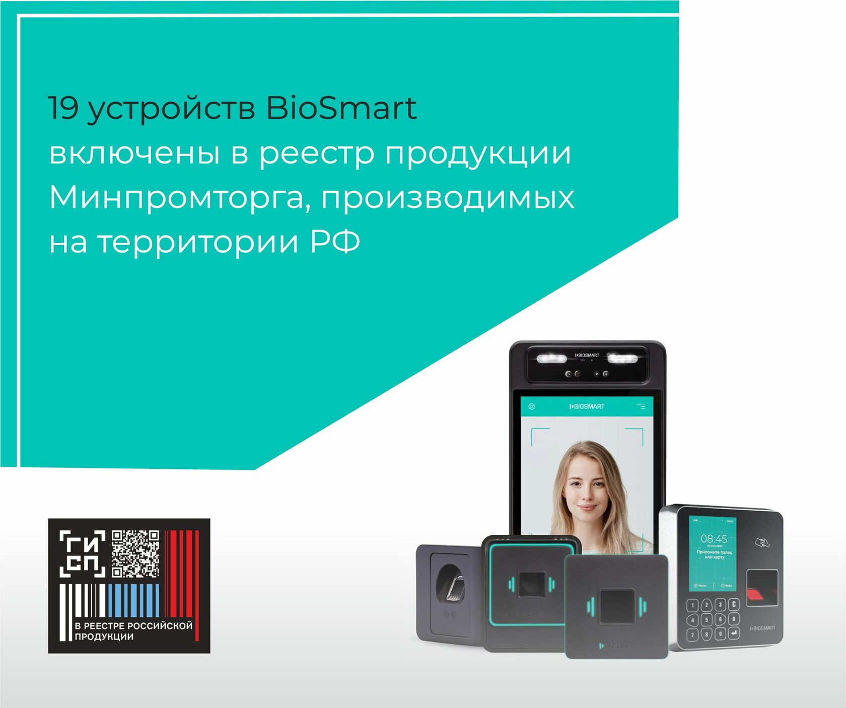 BioSmart получил заключение Минпромторга по Постановлению Правительства РФ от 17 июля 2015 г. № 719 «О подтверждении производства промышленной продукции на территории Российской Федерации», в соответствии с которым 19 наших устройств BioSmart 4-O, BioSmart 5M-O, BioSmart Mini-O, BioSmart PalmJet, BioSmart WTC2, BioSmart UniPass-EX, BioSmart Prox-E-EX, BioSmart Prox-E, BioSmart Mini-E, BioSmart PV-WTC, BioSmart 4-E, BioSmart UniPass Pro, BioSmart PV-WM, BioSmart 5M-E, BioSmart Quasar, BioSmart UniPass, BioSmart PalmJet BOX, BioSmart DCR-PV-XX, BioSmart DCR-PV внесены в реестр продукции, производимых на территории РФ.